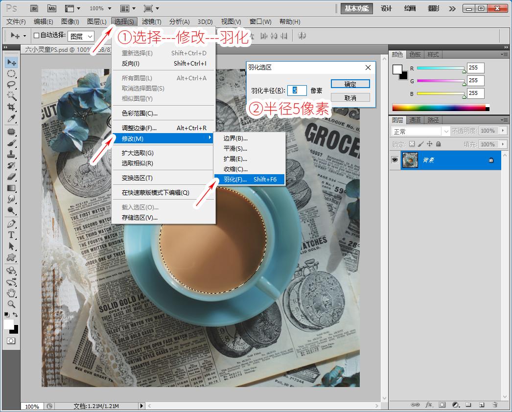 1、选择---修改---羽化【半径5像素】,快捷键Shift+F6,如图下: