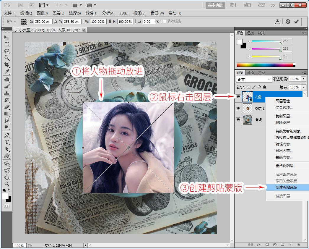 2、鼠标右健右击,人物图层,创建剪贴蒙版【快捷键Ctrl+Alt+G】,如图下: