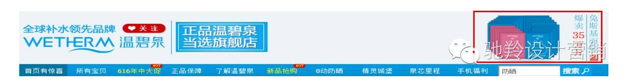 由于店招在一个店铺内,无论在任何页面都能看到,所以在店招上进行产品推荐会给消费者一个指引购买的作用,从而增加整个店铺更多的产品展示与点击。同时,这里可以放作为店铺引流的爆款产品,打造爆款,从而提高权重,增加店铺流量。