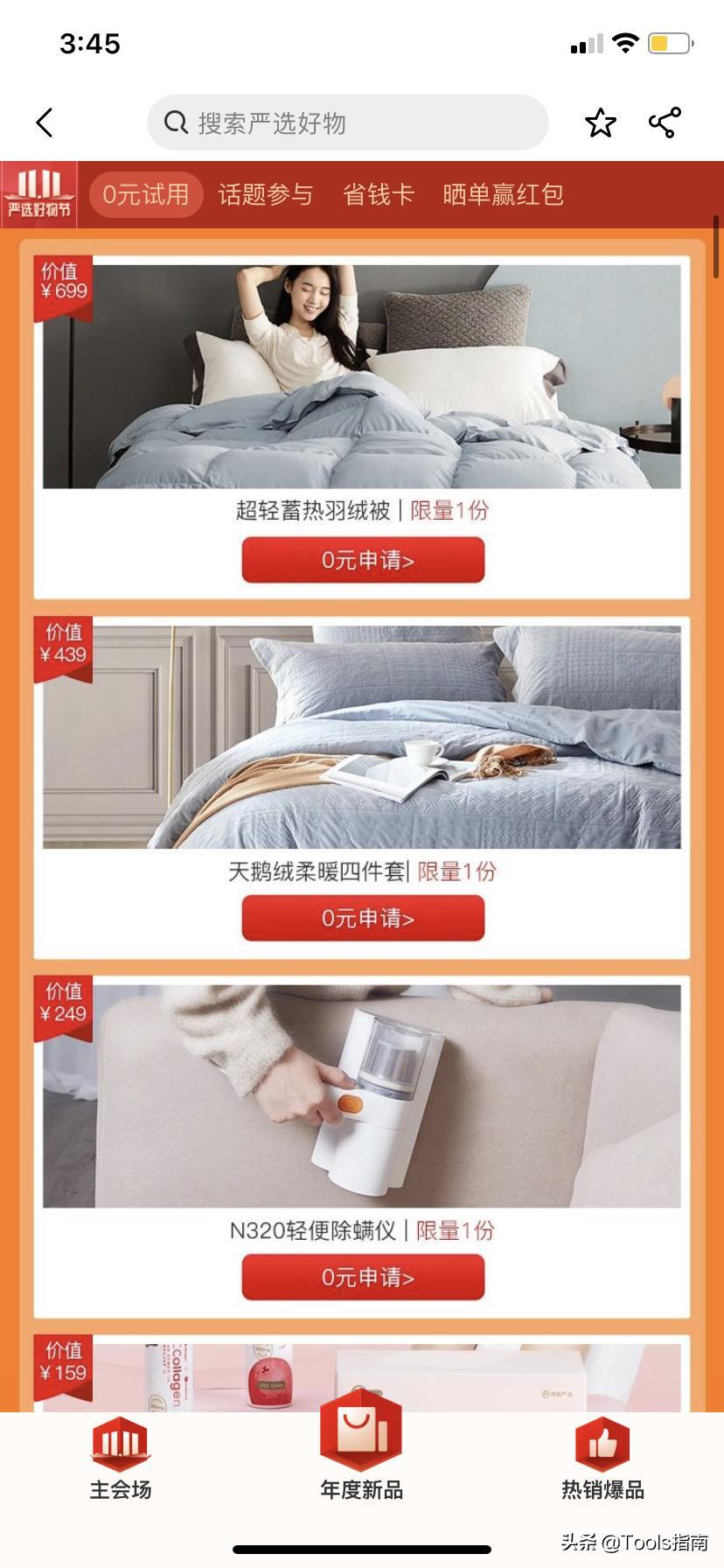 另外,严选还会推出“0元试新品”的活动,申请成功后就可以免费试用羽绒被、除螨仪等好用的商品~