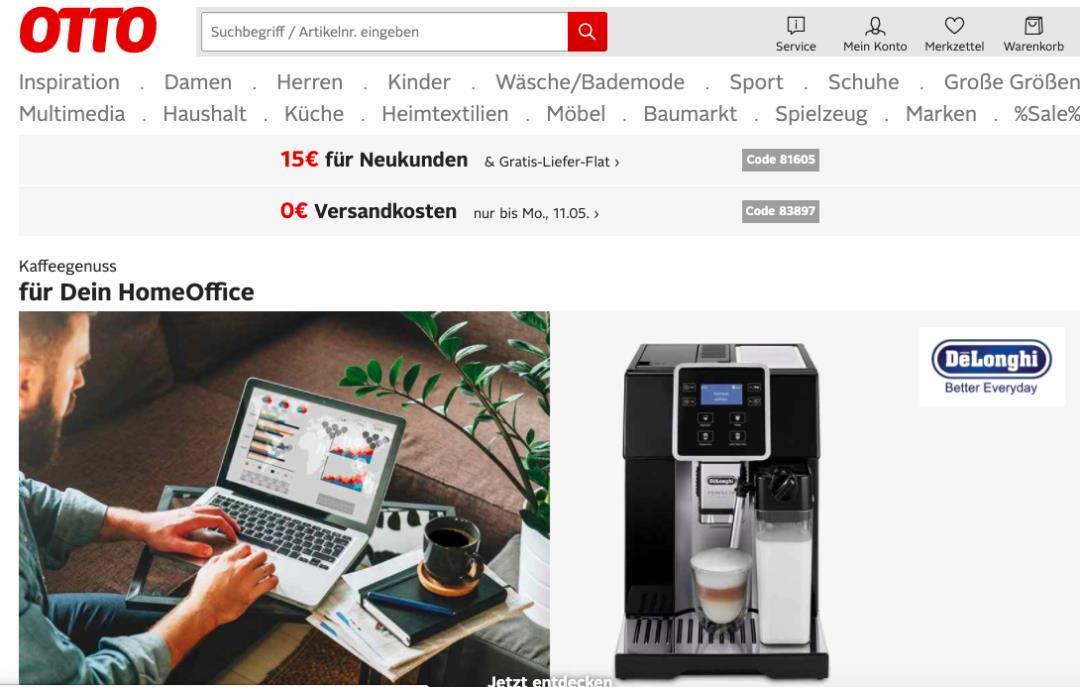 Otto也是我个人常用到的电商,上面锅具品牌比较齐全,价格也公道,而且新用户有15欧的代金券,我之前在这上面买了29,9欧的WFM果汁机,用了15欧代金券,最后只需要花14欧,相当划算。
