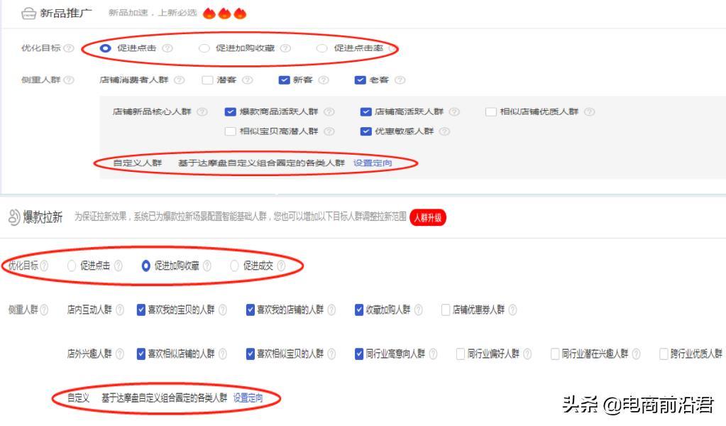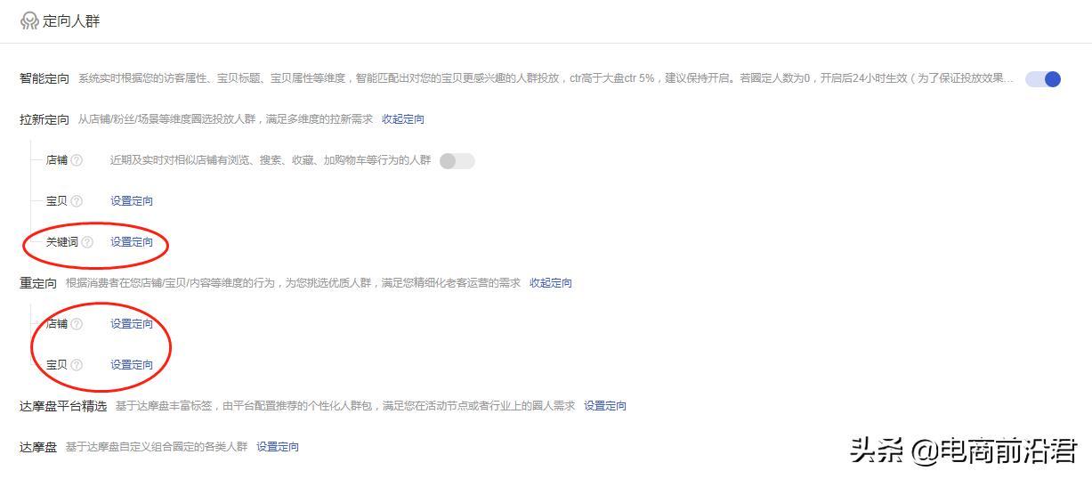 (1)定向人群:分智能定向人群,系统定向人群,达摩盘定向人群。