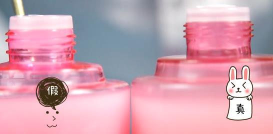 正品的粉水瓶盖和瓶身之间是有一条小缝隙的,非常小但是一定有;左边假货的缝隙就过分了,它不是缝隙,而是一条横沟哟。