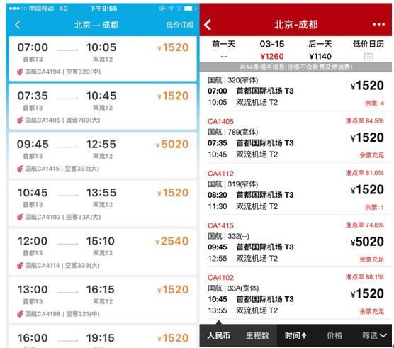 下图是3月15日早国航北京——成都航班列表,携程(左)、国航(右)的报价已经没有差异。这说明OTA已经失去“定价权”或者说“价格发现”功能,沦为航司管道。