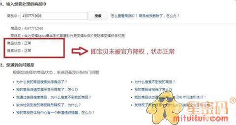 查询完毕显示后,如果显示商品状态:正常;搜索状态:正常,就表明该宝贝未被淘宝官方降权,宝贝状态正常。另外也可以前往卖家中心→体检中心→查看违规通知,如果没有任何通知则表示店铺一切正常。