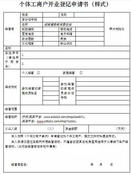 1、申请人在填写《个体工商户开业登记申请书》“经营场所”一栏时,应填报电子商务平台名称和网络经营场所网址。申请人在多个电子商务平台从事经营活动的,应当填报多个网络经营场所网址。