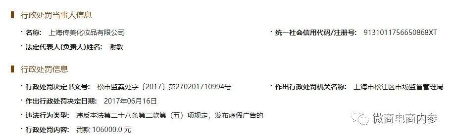 另据了解,谢玲此前还曾投资了上海传美化妆品有限公司,该公司曾因虚假宣传遭到了上海市松江区市场监督管理局的行政处罚:罚款 106000元。