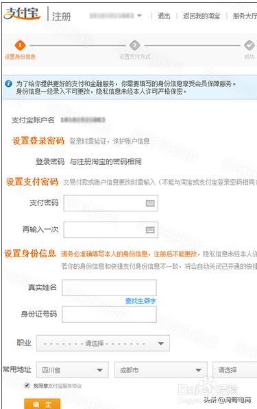 身份信息需要填写“真实姓名、身份证号码、职业、常用地址”等信息,最后勾选支付宝同意服务协议。