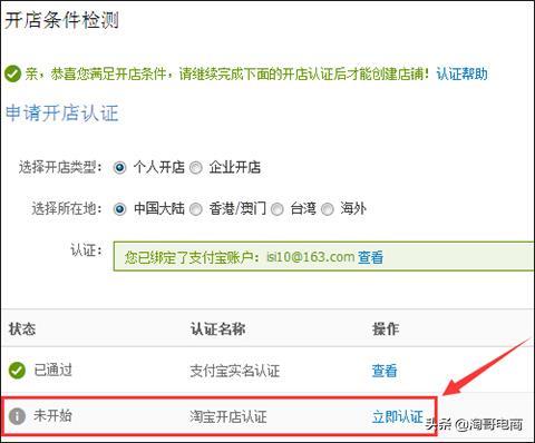 3、进入淘宝开店认证。截止现在您已经完成了开店条件检测,完成认证即可进入开网店的最后一步。