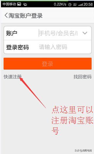 一般在淘宝买过东西就是有淘宝账号了,如果没有买过,那就需要新注册淘宝账号。如下图