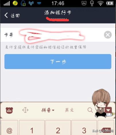 当你打开“实名认证”之后会弹出“添加银行卡”界面,要求你把已经开通网银的银行卡号填写在对应方框。