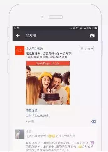 微信朋友圈广告是基于微信公众号生态体系,以类似朋友的原创内容形式在朋友圈中展示的原生广告。用户可以通过点赞、评论等方式进行互动,并依托社交关系链传播,为品牌推广带来加成效应,按曝光次数计费。