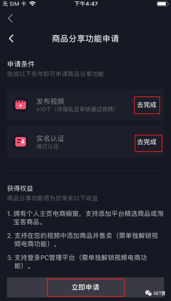 新手任务:10天内至少添加10件商品至商品橱窗,完成新手任务,若10天内未完成新手任务,权限将被收回且30天内不可再申请;