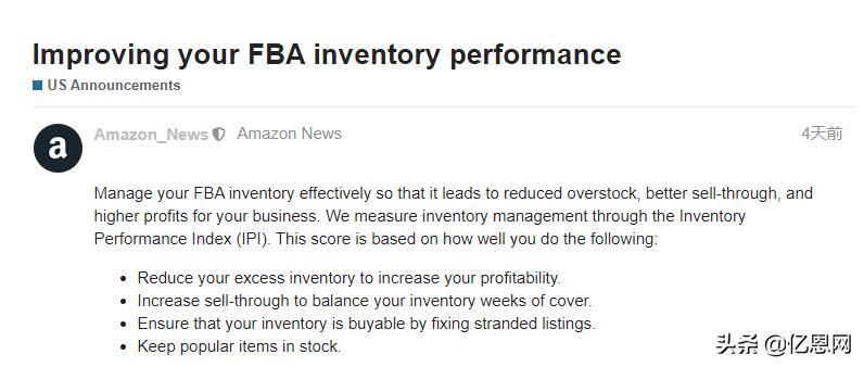 近日亚马逊发布了一则《改善您的亚马逊物流库存绩效》的公告,公告中也说明了影响库存绩效指标的因素,具体内容如下↓