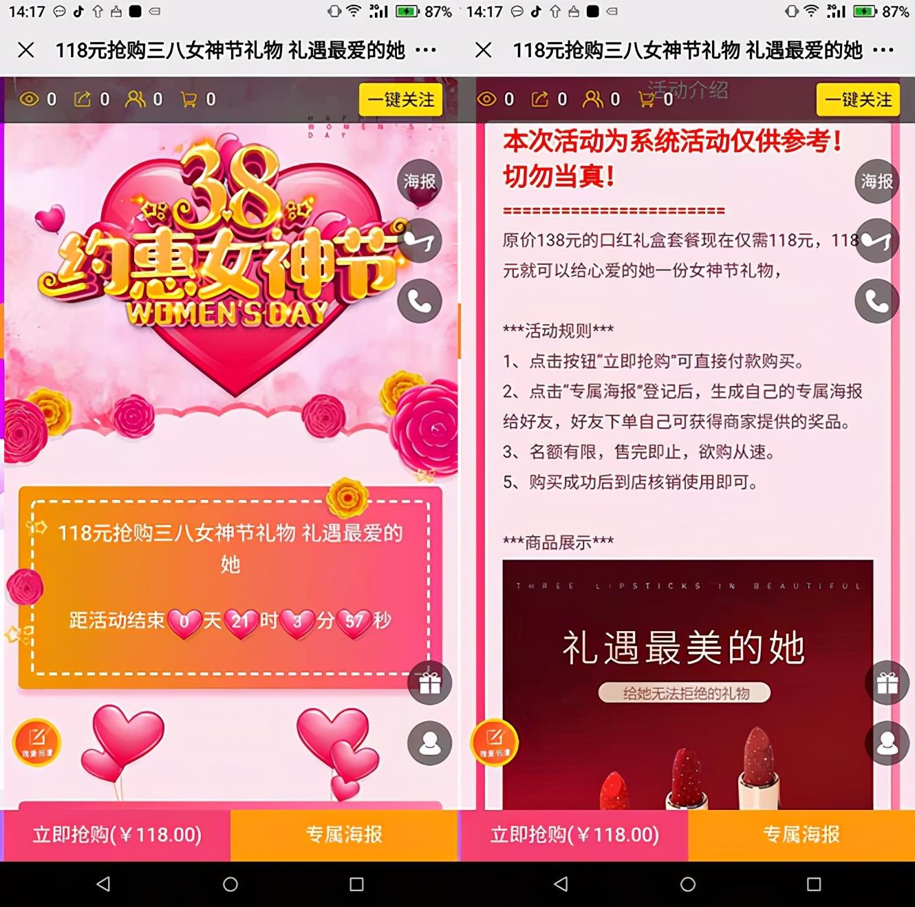 商家可以在这女性活动日,作出商品活动限时抢购、关注公众号集赞送礼、拉票评选等活动。制作活动页面,不要只是单纯发软文,这种效果不佳,最好是借助第三方工具(这里推荐vx关注独为信达公.众.号,里面的活动宝)制作具有互动性的活动页面。