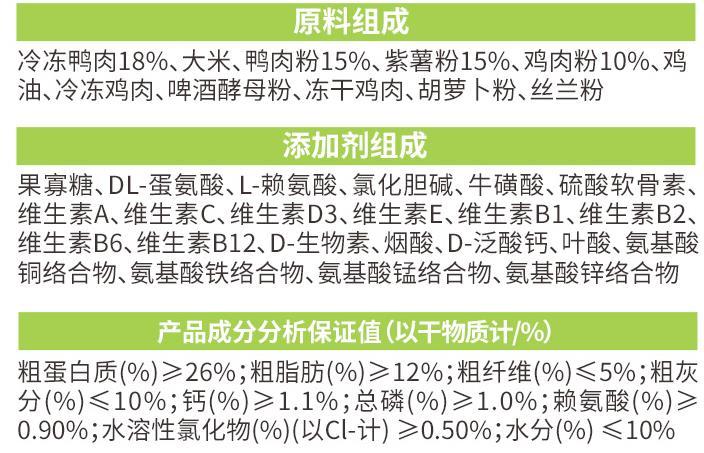 比乐守护者系列全价成犬粮,原料前五位分别是冷冻鸭肉、大米、鸭肉粉、紫薯粉、鸡肉粉等单看原料配比还是相当不错的,整体原料表中规中距。