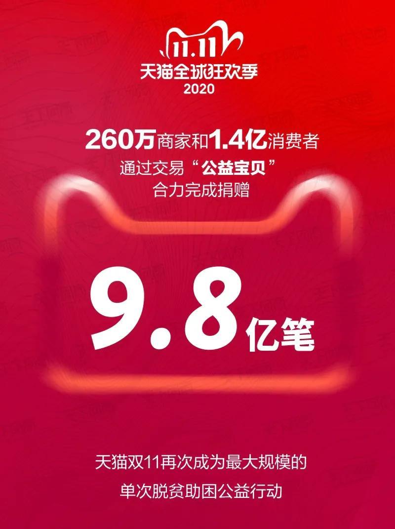 天猫双11,也是一场温暖的公益盛会。260万商家和1.4亿消费者通过交易“公益宝贝”,合力完成9.8亿笔捐赠。点滴善款,汇聚成浩荡大爱,为留守的女童,患病的孩子和偏远地区辛劳的妈妈们,送去关怀。