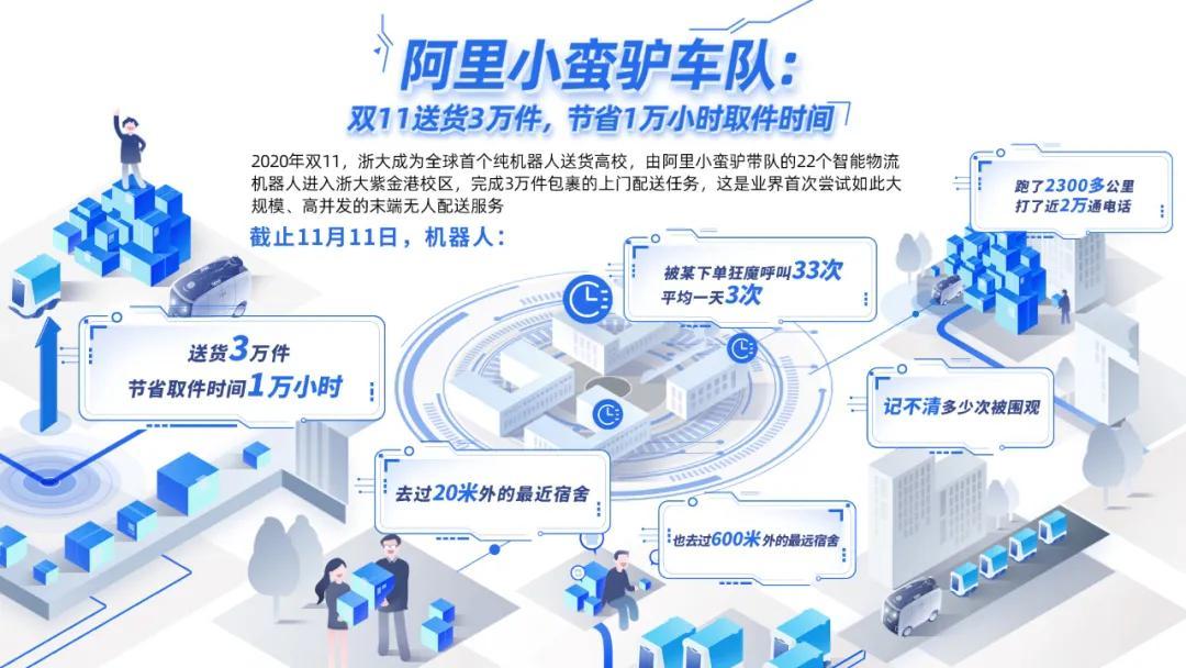 浙江大学成为全球首个纯机器人送货高校,阿里小蛮驴带队的22个机器人,截至11月11日已完成3万件包裹的配送。