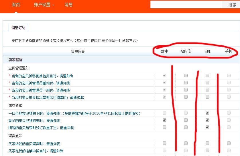 有邮件、站内信、旺旺、手机通知,根据自己的情况进行屏蔽,往下拉 拉到最底把这八个勾全部取消,就不会收到卖家的短信了,大家快去设置一下吧,转发给朋友,一起分享!