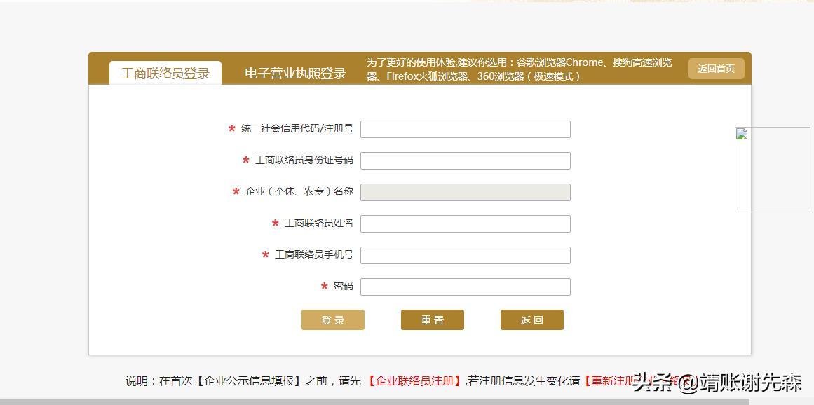 第2步:选择工商联络员登陆,然后按照提示填写。企业联络员如果需要注册或者变更的,则按以下操作:(1)首次填年报的企业要先“企业联络员注册”;(2)如果联络员信息发生变更,则在“联络员变更”中办理。