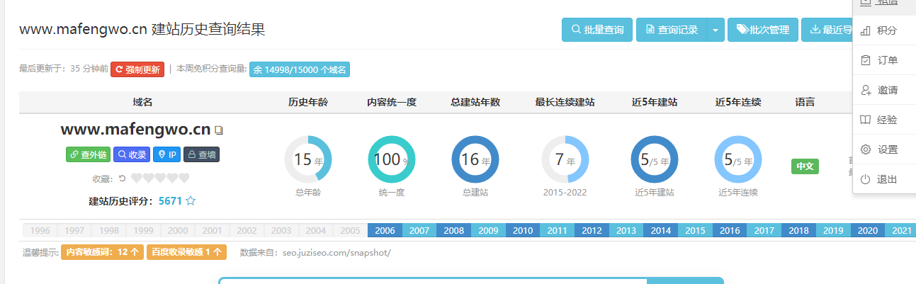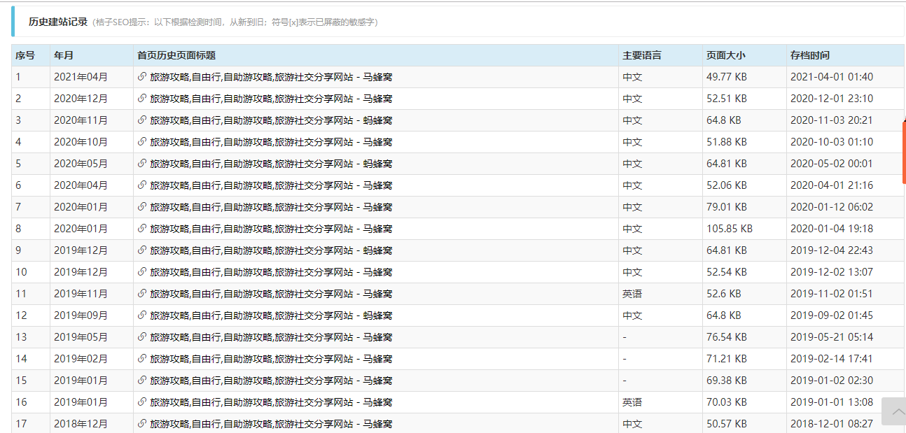 3、网站历史记录查询:网站历史记录查询工具,对于我们分析同行网站来说用处也是很大的,可以看到同行域名的具体使用情况。在我们寻找老域名的时候也是可以用到的。