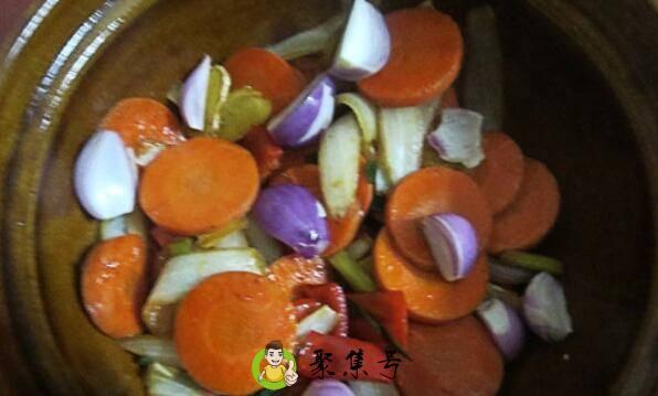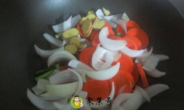 4、热锅倒入大半酱汁,再将姜、蒜苗、红辣椒、洋葱、胡萝卜倒进去炒两分钟。