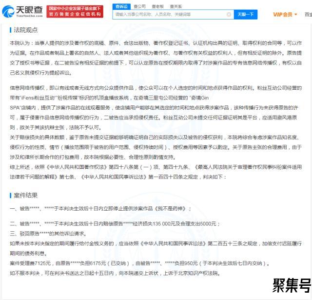 文书显示,原告优酷公司诉称,其享有电影《我不是药神》的网络独播权,两被告未经授权,在奇境主题养生馆GinSPA(三里屯店)内,擅自提供涉案作品的在线播放服务,兜售电影足疗套餐,同时还添加片前和角标广告,谋取双重收益。粉丝互动公司则辩称,影片系用户上传,公司接通知后第一时间删除,不应担责;奇境三里屯公司没有过错。