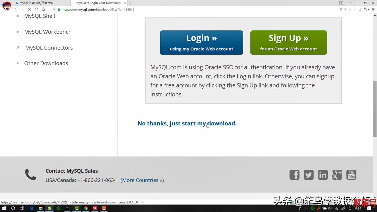 点击“No thanks,just start my download”链接,便开始下载MySQL Installer。