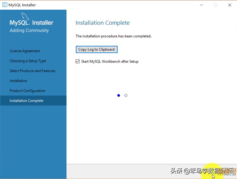 到这一步,大功告成,MySQL数据库安装完毕,单击【Finish】按钮即可完成安装。