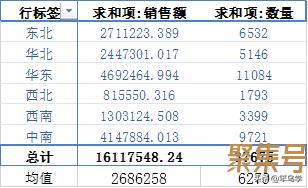 第一步:用数据透视表统计出各个地区的销售额和数量,并求出销售额和数量的均值,如下表所示。