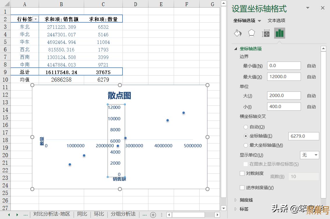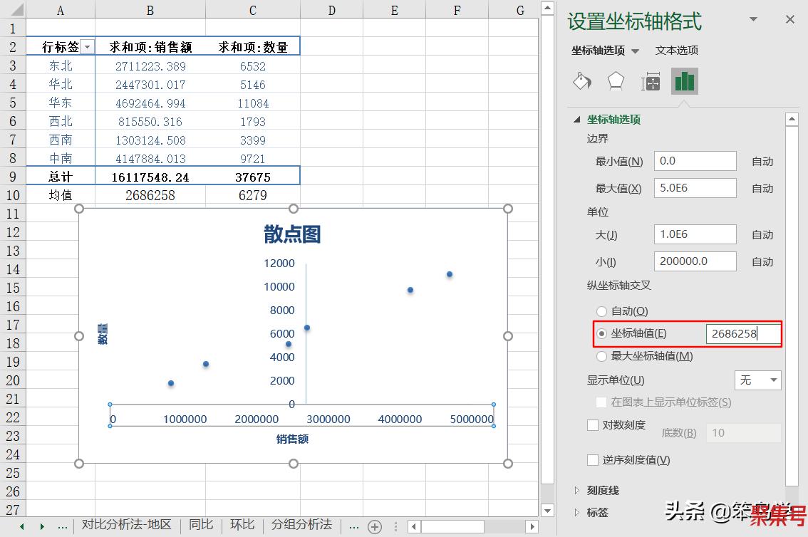选中横坐标,在坐标轴选项中,将“坐标轴值”设置为销售额的均值2686258。
