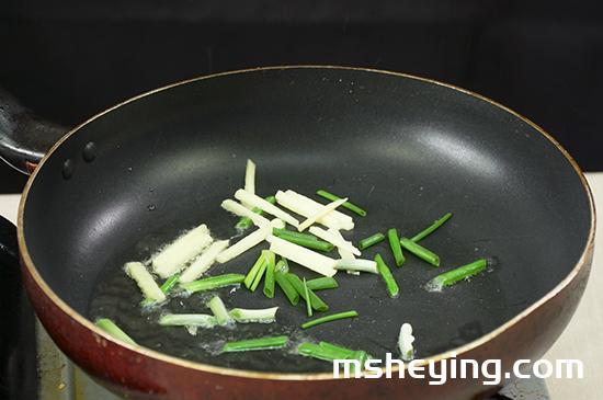 3、起锅烧油,油热后放入葱、姜炒出香味后,加入适量水烧开,再放入切好的菠菜段。