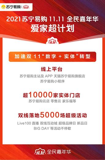 苏宁易购发布“11.11爱家超计划”,全面启动2021双十一全民嘉年华。在消费升级、线下线上融合的大趋势下,苏宁易购将集中全部资源打造双十一购物季“爱家消费”主阵地,以自身优势打造三大关键词:聚焦家电家装消费、发挥双线融合优势、升级品质服务。