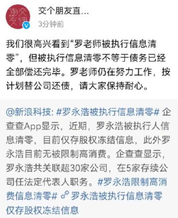 正文 罗永浩方回应被执行信息清零(罗永浩6个亿还完没) kpjjhadmin V管理员 /2022-01-05 18:48:10 /178 阅读 0105 1月5日消息,据企查查App显示,近期,罗永浩被执行人信息清零,目前仅存股权冻结信息,此外罗永浩目前无被限制高消费。交个朋友官回应:我们很高兴看到“罗永浩执行案件已终结”,但被执行信息清零不等于债务已经全部偿还完毕。罗老师仍在努力工作,按照计划替公司还债,请大家保持耐心。 声明:本文内容及图片来源于读者投稿,本网站无法甄别是否为投稿用户创作以及文章的准确性,本站尊重并保护知识产权,根据《信息网络传播权保护条例》,如果我们转载的作品侵犯了您的权利,请在一个月内通知我们,我们会及时删除。请将本侵权页面网址发送邮件到laoyang1981@qq.com,我们会及时做删除处理。