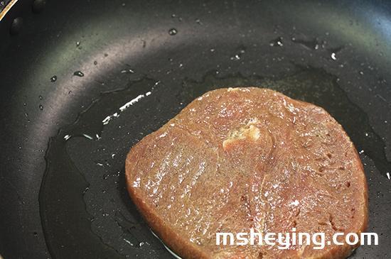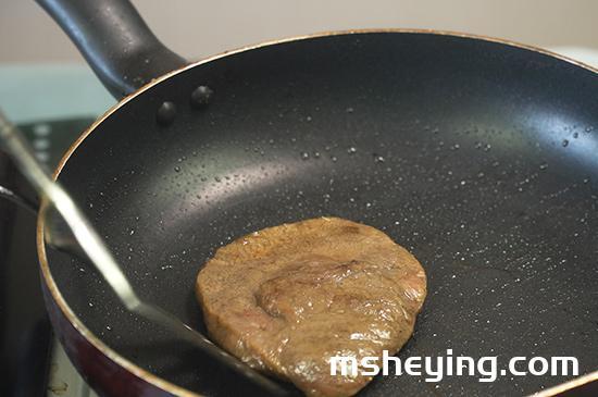 2、起锅烧油,将牛肉放入锅中,翻炒至2分钟后,再翻面煎2分钟。