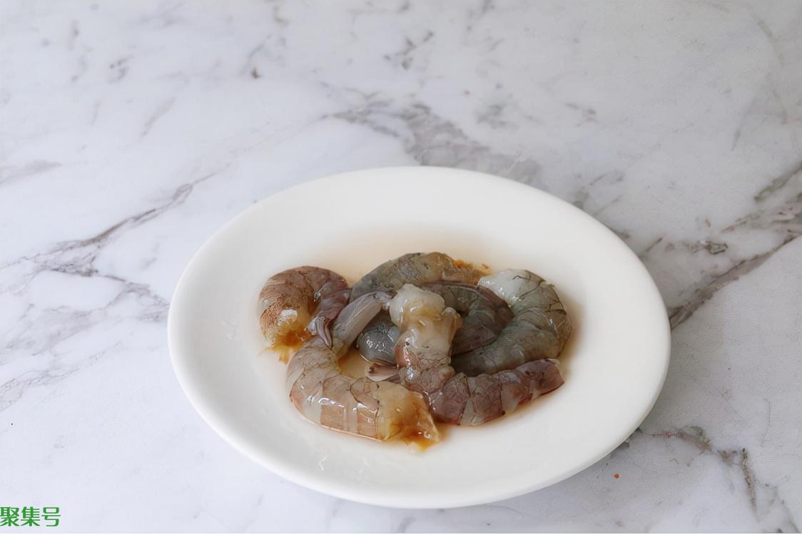 步骤二、接着把经过解冻的大虾剥掉虾壳,去掉虾头和虾须等不可食用部分,放在流水下简单冲洗两遍沥去水分后装入盘中,加一勺料酒去除腥味异味,再放一克食盐,抓拌均匀以后放在阴凉避光处腌制十分钟到十五分钟。