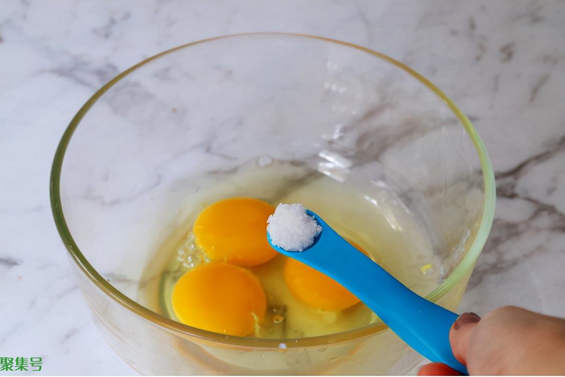 步骤四、在干净无水的容器中磕入三个鸡蛋,加一小勺食盐将蛋液全部搅散,搅成均匀的全蛋液。