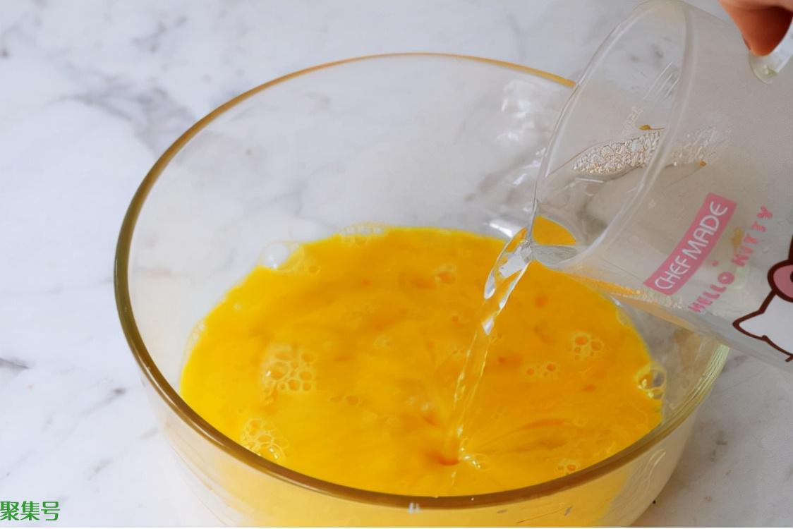 步骤五、往搅好的鸡蛋液中倒入蛋液一点五倍的温水一起混合。