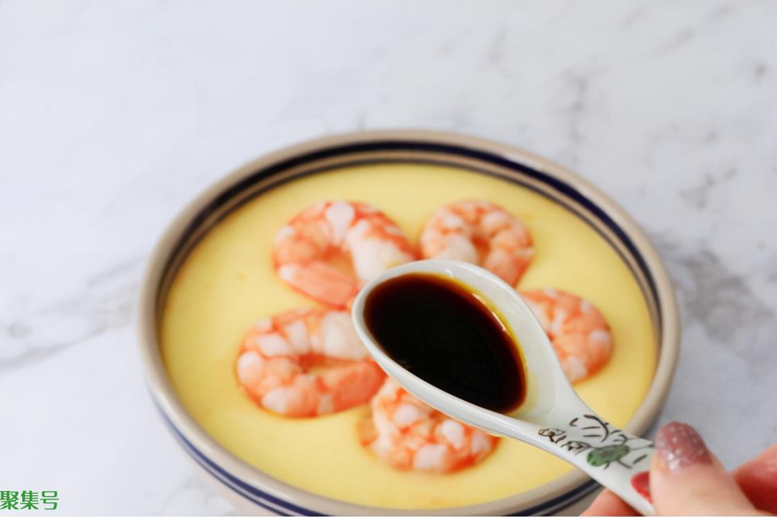 步骤十二、戴上隔热手套把蛋羹取出来,用小勺舀入适量的生抽进行调味。