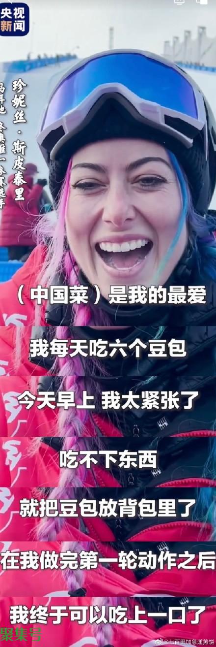 在2月9日的单板滑雪女子U型场地技巧资格赛结束后,珍妮丝接受了记者采访。她说太紧张了,早上吃不下东西,只能把豆包放在口袋里,做完动作终于能吃了,“我爱吃豆包,味道好极了。”珍妮丝说,中国菜是她的最爱,冬奥会期间,她一天要吃6个豆包,早餐吃俩,午餐吃俩,晚餐吃俩。