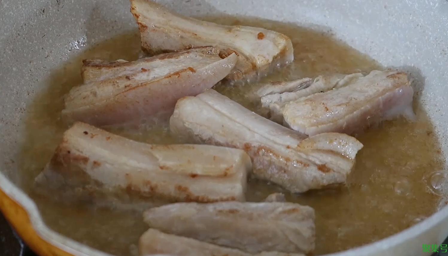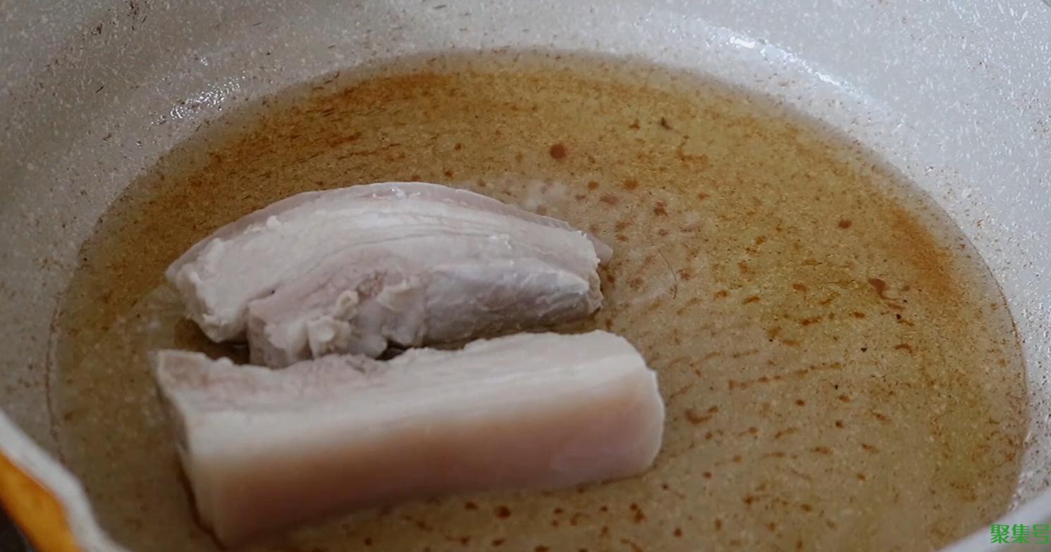 4、等到五花肉完全泡凉之后咱们再将五花肉清洗干净。清洗完了之后再捞出来控干水分,然后放到一旁备用。在平底锅中加入适量的食用油,可以稍微多一点,然后咱们将五花肉放进去煎一下。