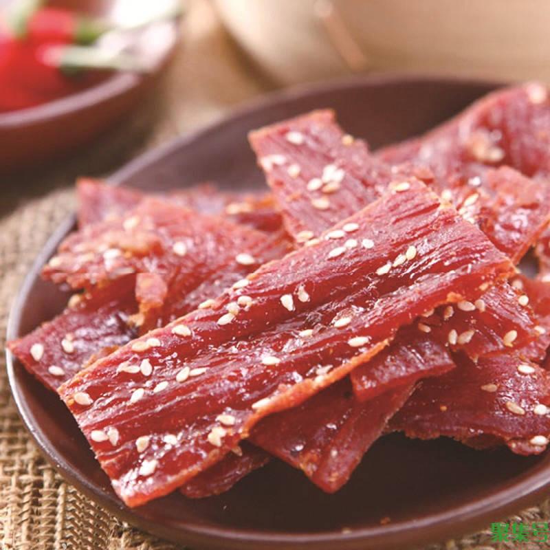 猪肉脯是一种用猪肉经腌制、烘烤的片状肉制品,色泽呈鲜艳的棕红色,具有口感丰富,咸中微甜,芳香浓郁,余味无穷。