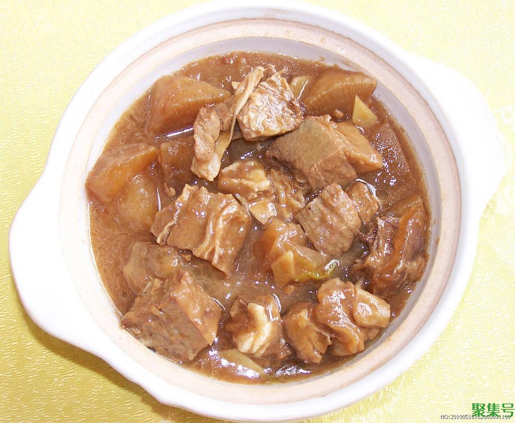 炖肉,风味独特,是广东梅州婚宴喜庆及节日必用的名菜。炖肉有炖猪肉和炖牛肉两种。刚出炉的炖肉是金黄色的,炖肉软烂但不崩碎,方块整齐,肉味浓郁醇厚,食而不腻。