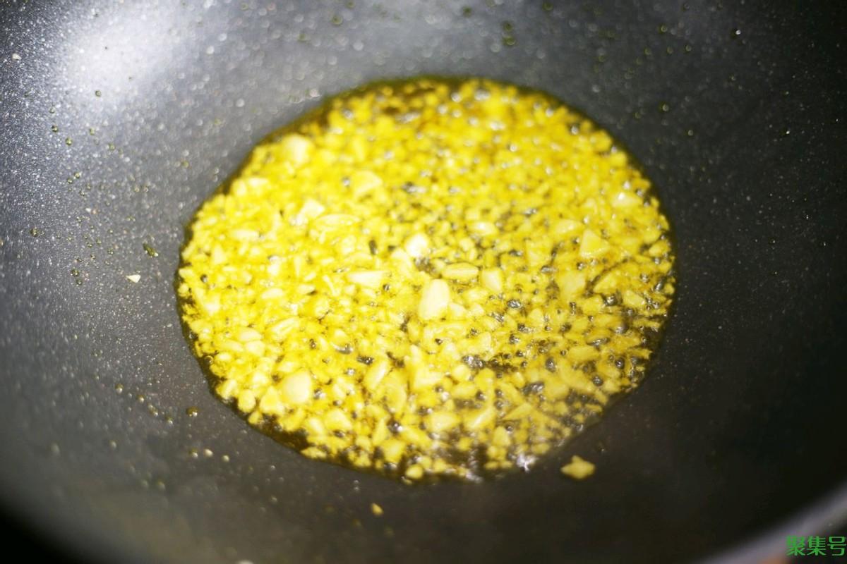 3、锅中加入适量的食用油烧热,然后放入切好的蒜末,爆炒出香味。