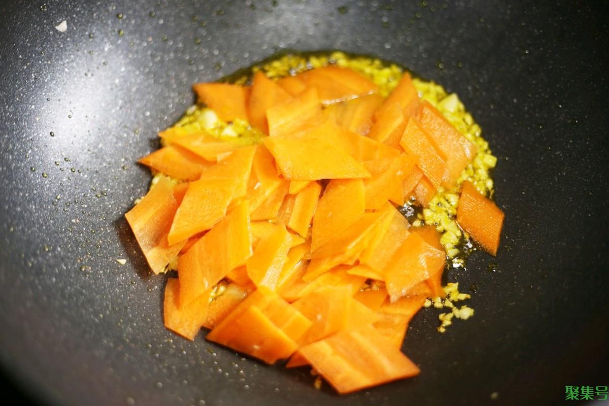 4、加入切好的胡萝卜块,再加入西葫芦木耳。