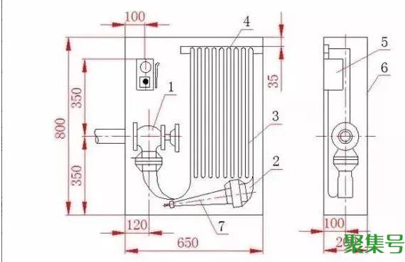 1-消火栓;2-水带接口;3-水带;4-挂架;5-消防水泵按钮;6-消火栓箱;7-水枪