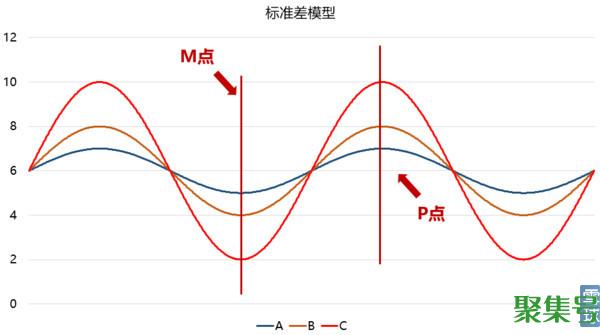 请看下图,三个指数的平均值都是6,A的标准差最小,只有0.71,C的标准差最大,高达2.82。