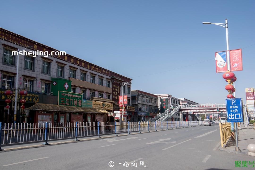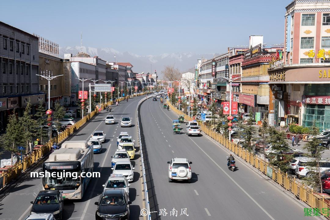 放眼望去,蓝天下是若隐若现的雪山,近处是带有新派藏式风格的建筑,这些建筑一般三到五层,外观采用简单的色调。