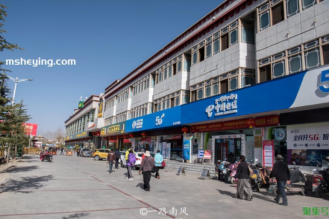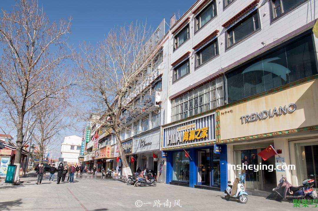拉萨的街景带有浓郁的藏族特色,但在其他城市随处可见的连锁品牌在这里也能找到,包括但不限于服装、餐饮等。