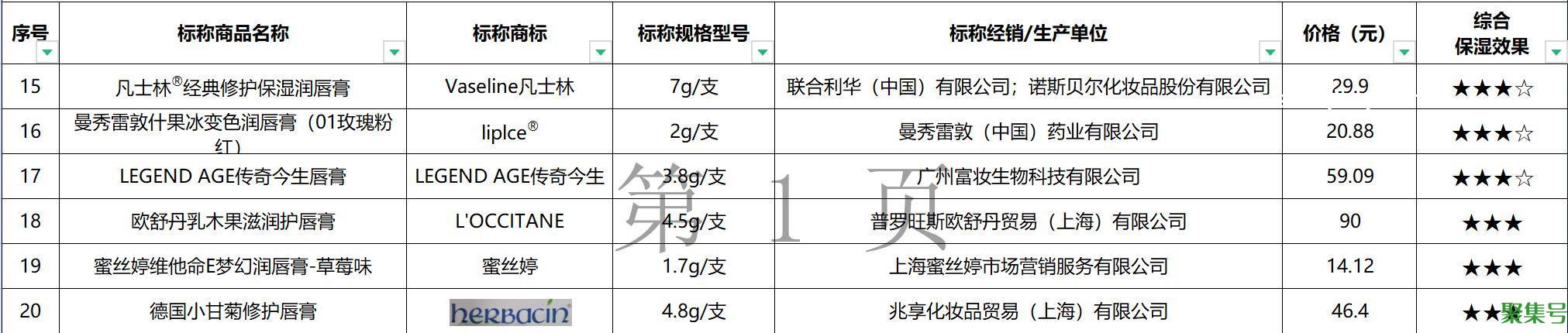 检测结果发现,20件样品保湿效果差异明显,其中4件样品获得五颗星,1小时、2小时、4小时均具备良好的保湿效果;2件样品四颗半星;8件样品四颗星;3件样品三颗半星;3件样品三颗星,保湿效果一般,具体样品名称为欧舒丹乳木果滋润护唇膏(售价90元)、蜜丝婷维他命E梦幻润唇膏-草莓味(售价14.12元)和德国小甘菊修护唇膏(售价46.4元)。而样品名称为“凡士林?经典修护保湿润唇膏”、“曼秀雷敦什果冰变色润唇膏(01玫瑰粉红)”等的样品同样表现不佳,仅获三颗半星。